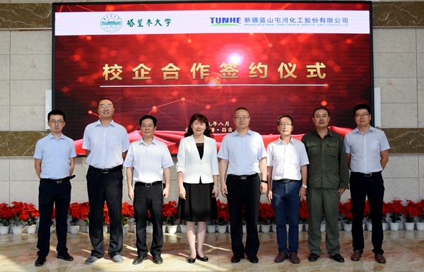 球盟会公司党委副书记、副总经理赖勇与塔里木大学副校长张利莉代表双方签订了校企相助协议书。塔里木大学党校办副主任于涛、生科院党支部书记白红进、副院长杜增智及屯河能源公司副总经理廖鹏、屯河聚酯公司副总经理徐东等相关人员加入了签约仪式。