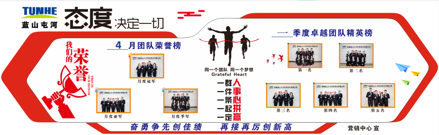 为塑造积极向上的销售竞争文化,让营销中心全体干部职工珍惜荣誉,牢记使命,营销中心近期专门打造了具有营销特色的荣誉墙。通过荣誉墙对中心销量完成率、利润完成率排名前十五名的员工进行公示表扬,对当月团队业绩排名前三、季度排名靠前的团队进行展示勉励。